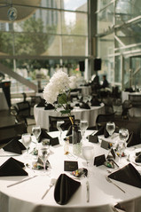 Gretel & Henry’s design vision was for a modern, geometric, and clean design, and the Art Gallery of Alberta fit that bill perfectly. We chose a black, grey and white palette with accents of gold to provide the drama while keeping the design clean and modern to coordinate with the venue. Gretel, being artistically inclined, took on the challenge to craft the décor at their ceremony and reception.